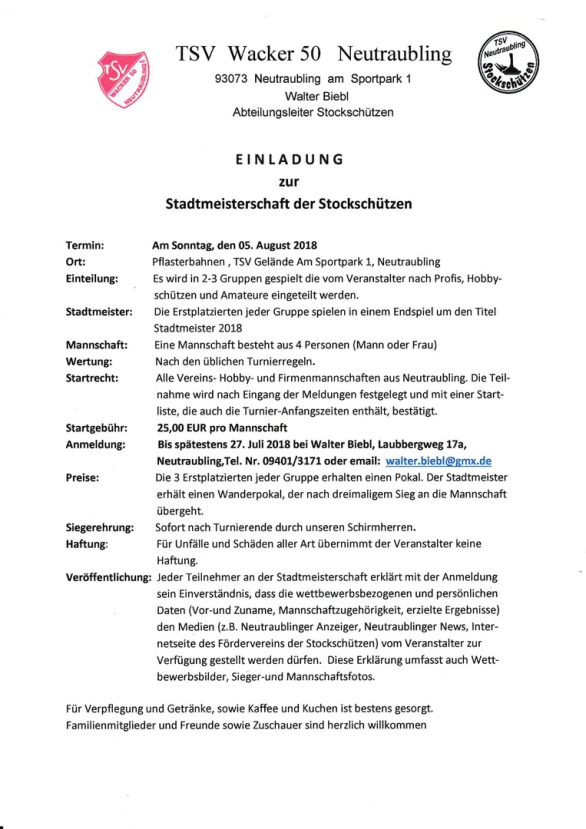Bei hochsommerlichen Temperaturen kämpften am 05.08.2018 beim TSV Neutraubling 16 Mannschaften um den Titel Stadtmeister im Stockschießen.